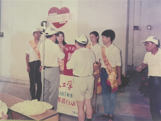 李小兵(左一)参与1991年华东水灾募捐活动 |