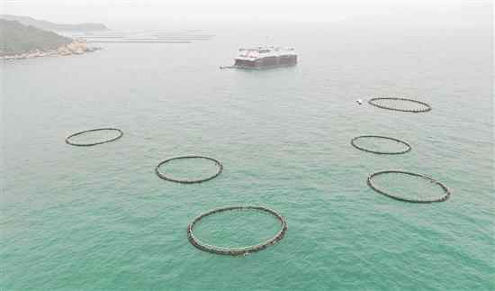 广东推进现代化海洋牧场建设。这是在珠海万山海域拍摄的养殖网箱及中国首台半潜式波浪能养殖旅游平台“澎湖号” 新华社发